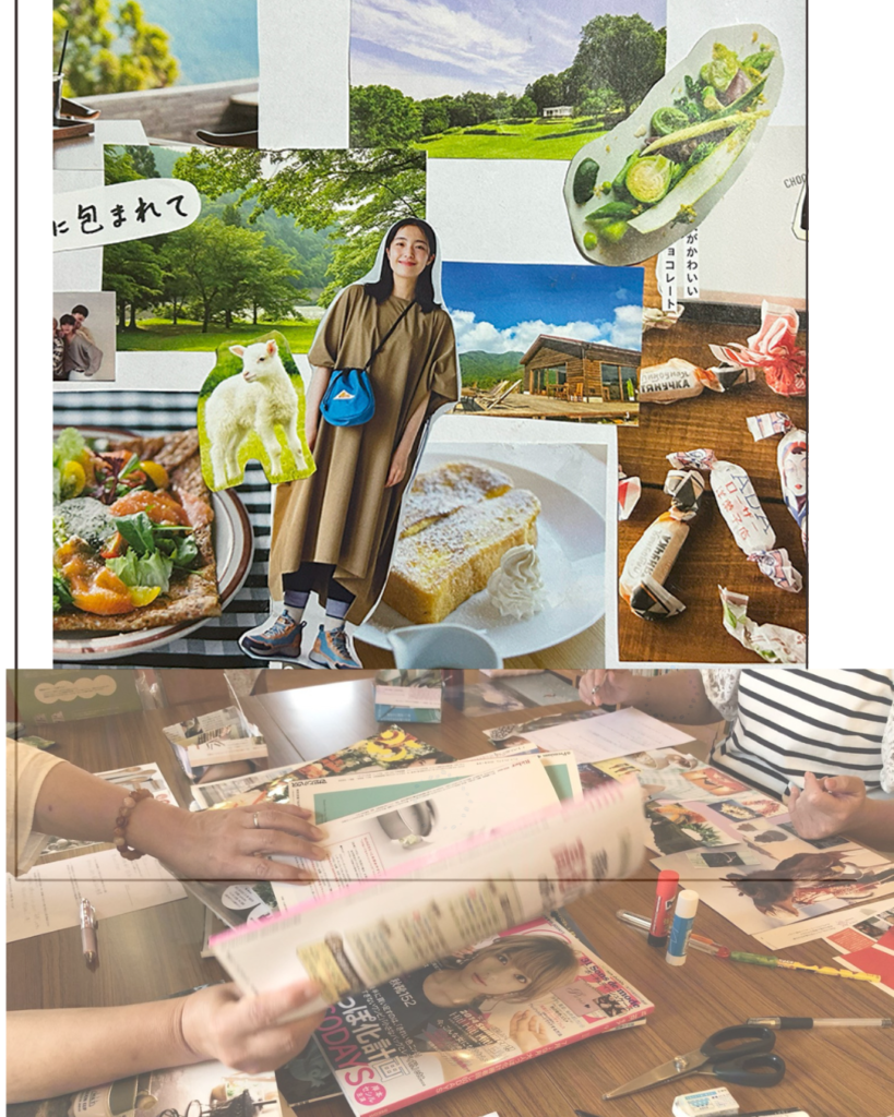 「子育てが終わり、空っぽになった心に何を入れたらいいか分からず途方に暮れていました。コラージュワークで、まさか自分がこんなにも旅行に行きたがっていたなんて!頭で考えたら『贅沢かな』と諦めていた夢が、視覚化されて一気に現実味を帯びました。今では友人と旅行の計画を立てています。」